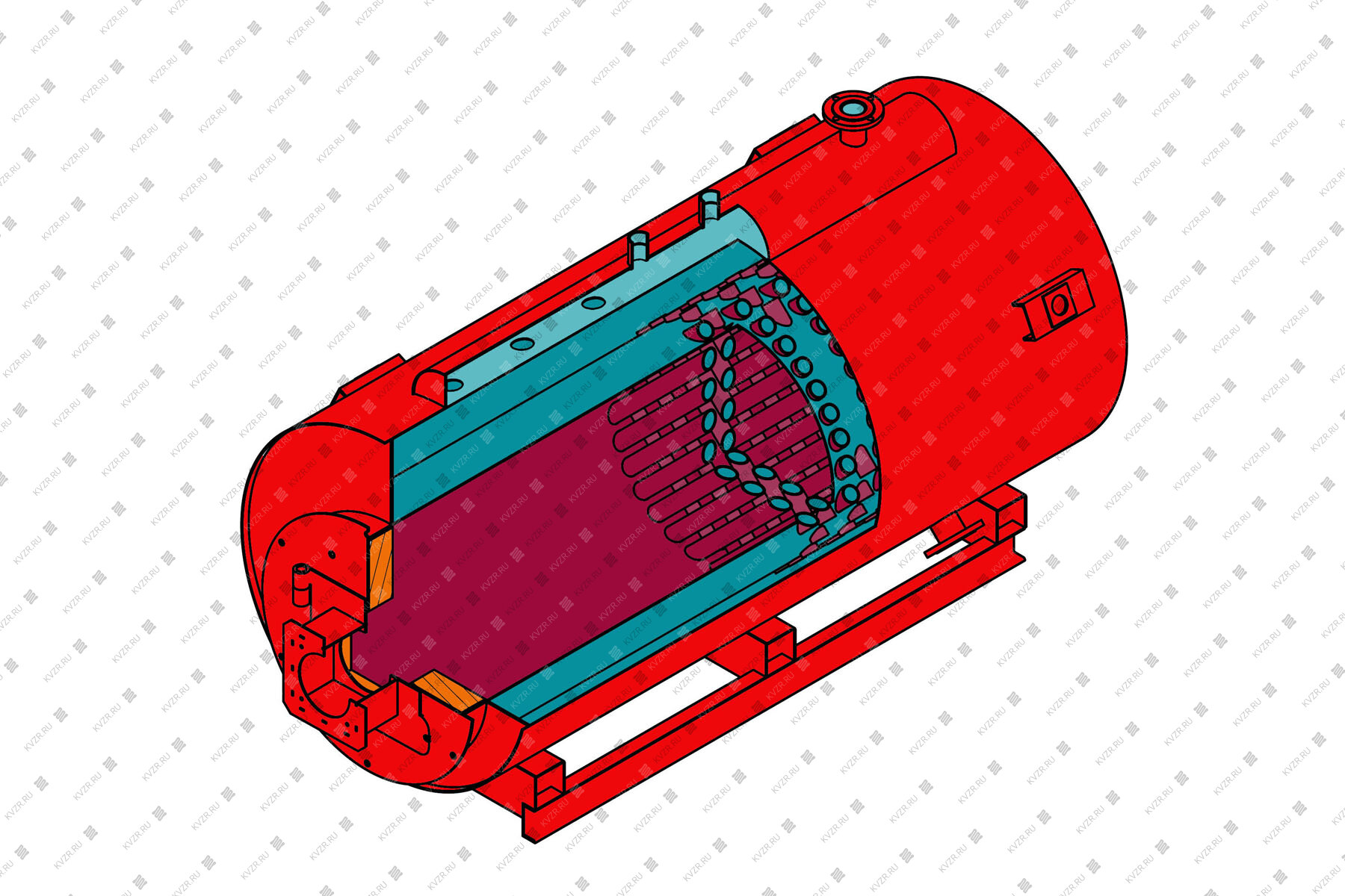 Теплообменник изготавливается из двух стальных цилиндров разного диаметра, вставленных один в другой и соединенных между собой фланцами и конвективными трубами. В верхней части теплообменника приварен паросборник, представляющий собой полуцилиндр. Конвективный трубный пучок соединяет верхнюю и нижнюю часть водяной рубашки котла, пар образуется при испарении нагреваемой воды и собирается в паросборной камере, далее через паропровод направляется потребителю на технологические нужды. Дымовые газы проходят через трубный пучок и выходят в верхней части котла. В передней части жаровой трубы размещена топка амбразурой под горелку, а в задней части - конвективный пучок труб. Топливо подается через горелку, паропроизводительность регулируется путем увеличения или уменьшения количества топлива. Температура сухого насыщенного пара низкого давления регулируется изменением давления пара, чем ниже давление пара, тем ниже температура.