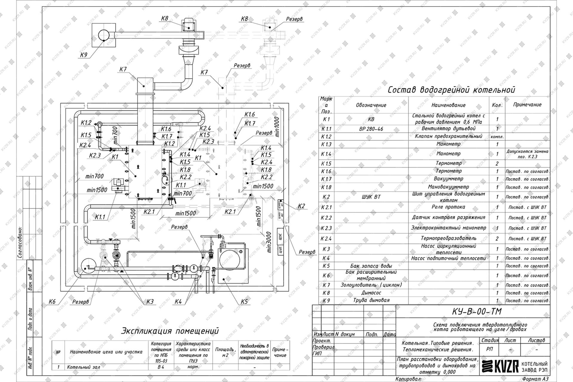 Образец тепловой схемы подключения котла 0.4 МВт уголь дрова и вспомогательного оборудования в котельной приведен на данной схеме. При эксплуатации очень важно грамотно осуществить подключение оборудования, установить все контрольно измерительные приборы, для контроля параметров работы котельной и запорную арматуру для оперативного переключения потока теплоносителя при плановой или аварийной остановке оборудования. Данную схему можно использовать как пример для разработки под свой объект или заказать у нас разработку индивидуальной схемы для вашей котельной.