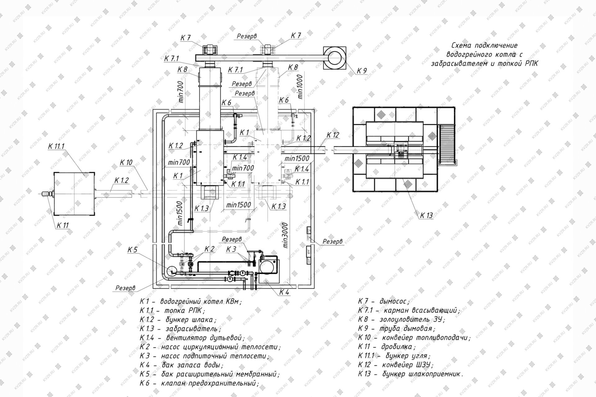 Для эффективной и надежной работы котла КВм-1,5 с ЗП РПК в вашей котельной вам потребуется дополнительное оборудование - автоматика ЩУК, дымосос, насос сетевой и подпиточный, золоуловитель (по желанию), транспортеры, газоходы и переходники для газового тракта, дымовая труба. Мы предлагаем рассмотреть типовые варианты комплектации.