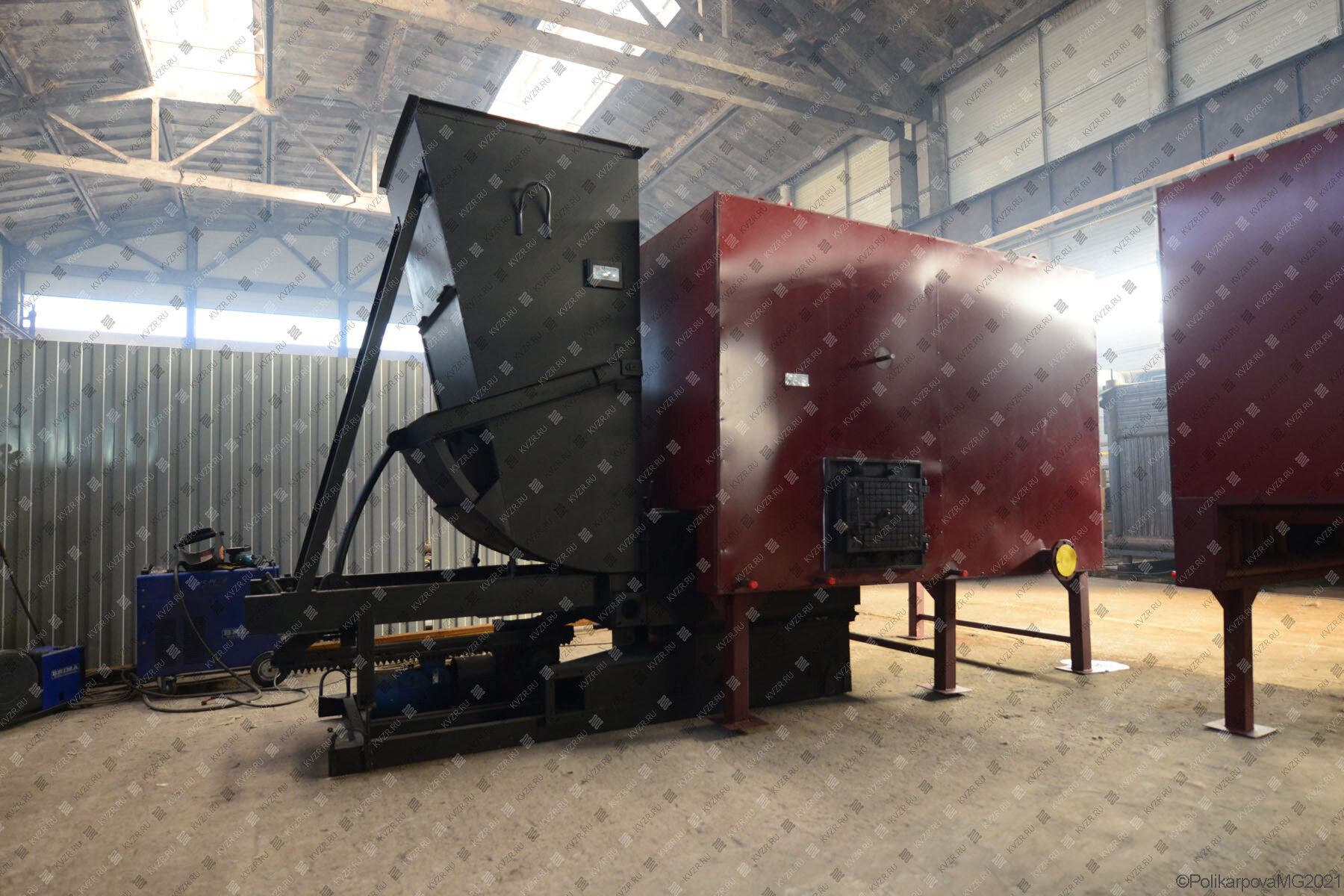 Механические котлы КВм с топками ЗП РПК поставляются двумя блоками. Топочный блок и топка с опрокидывающими колосниками. Топливо в бункер забрасывателя подается транспортером топливоподачи. На фронте установлена плита для крепления забрасывателя, на фронте и на боковой стенке котла установлены дверки для обслуживания топки и контроля процесса горения.
