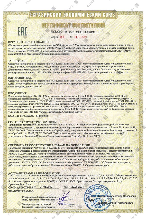 Сертификат на водогрейные котлы на твердом и жидком топливе