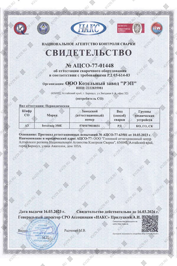 Котельным заводом получено очередное свидетельство № АЦСО-77-01448 об аттестации сварочного оборудования в соответствии с требованиями РД 03-614-03, выданное национальным агентством контроля сварки ("НАКС").