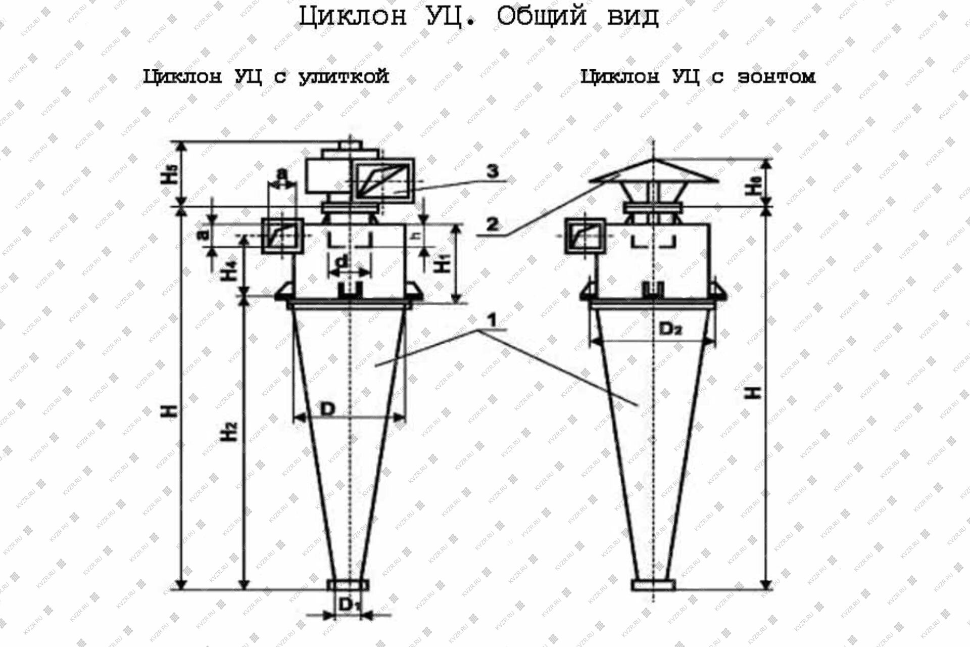 Конструктивными особенностями пылеуловителя УЦ является увеличенный диаметр средней части корпуса и длина конического нижнего сегмента. Внутри корпуса проходит вертикальная стальная труба для выхода очищенного воздуха, которая внутри снабжена спиралевидным патрубком или зонтом. В верхней части корпуса располагается входной патрубок, который своей спиральной формой задает направление вращения запыленному потоку воздуха. Нижняя конусная часть корпуса снабжена фланцем для соединения с пылесборным бункером.