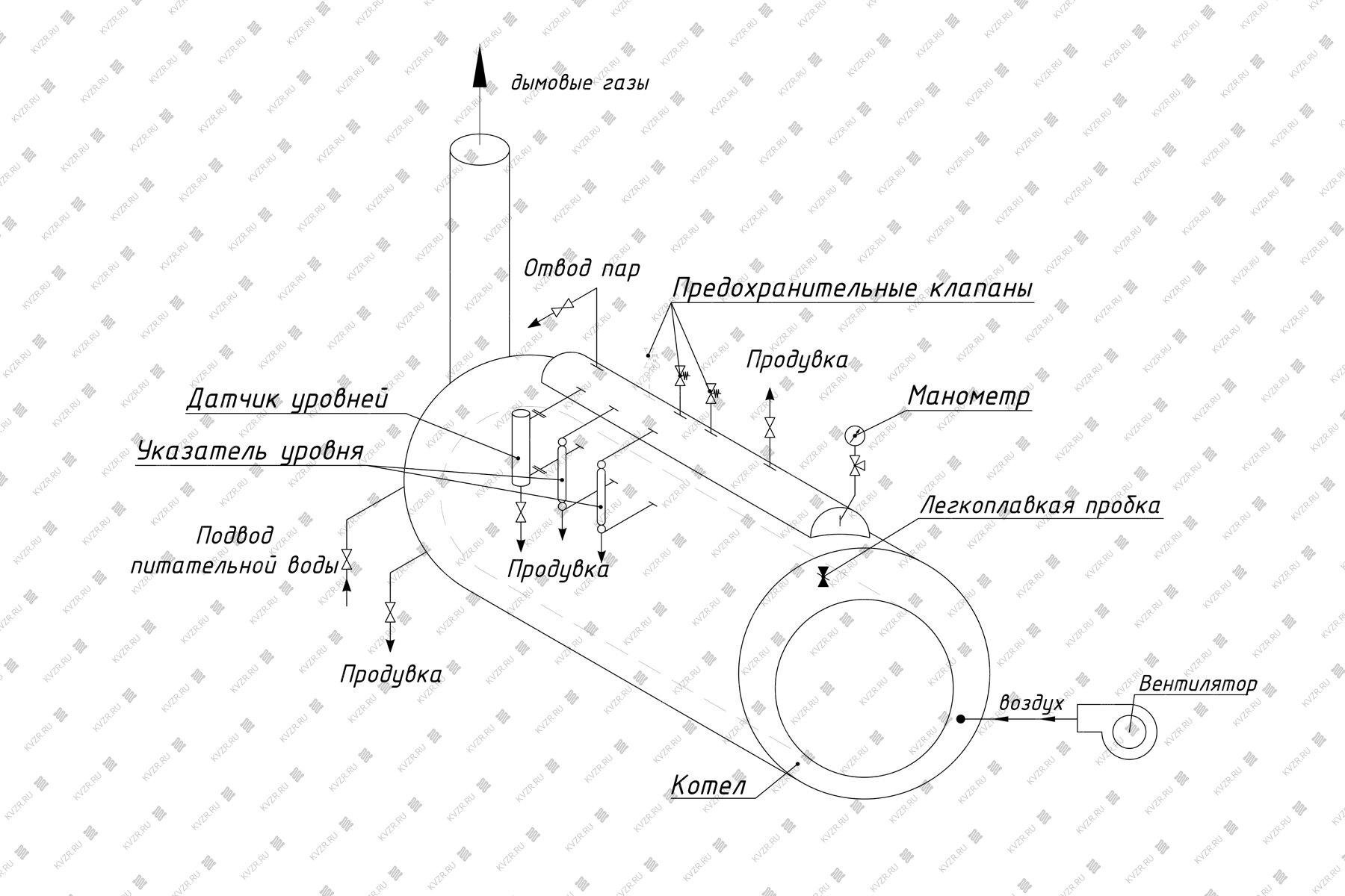 Дымовые газы, образующиеся в результате сгорания того или иного вида топлива, проходят из топки через трубный пучок, который соединяет водяные рубашки котла. Вода нагревается и превращается в насыщенный пар температурой до 170 градусов, который собирается в паросборнике и затем по паропроводам подается потребителям на различные нужды. Удаление продуктов сгорания происходит через дымовую трубу.