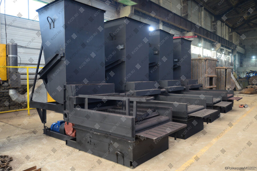 Водогрейные котлы КВм с топкой ЗП РПК устанавливаются в котельных с механическими топливоподачей и шлакоудалением. Устройство водогрейного котла с ЗП РПК организовано следующим образом. На фронте установлена плита для крепления забрасывателя ЗП 400 или ЗП 600, на фронте и на боковой стенке котла установлены дверки для обслуживания топки шуровки, очистки и контроля процесса горения. Топливо по неподвижной колосниковой решетке разбрасывается с помощью вращающихся лопастей забрасывателя.