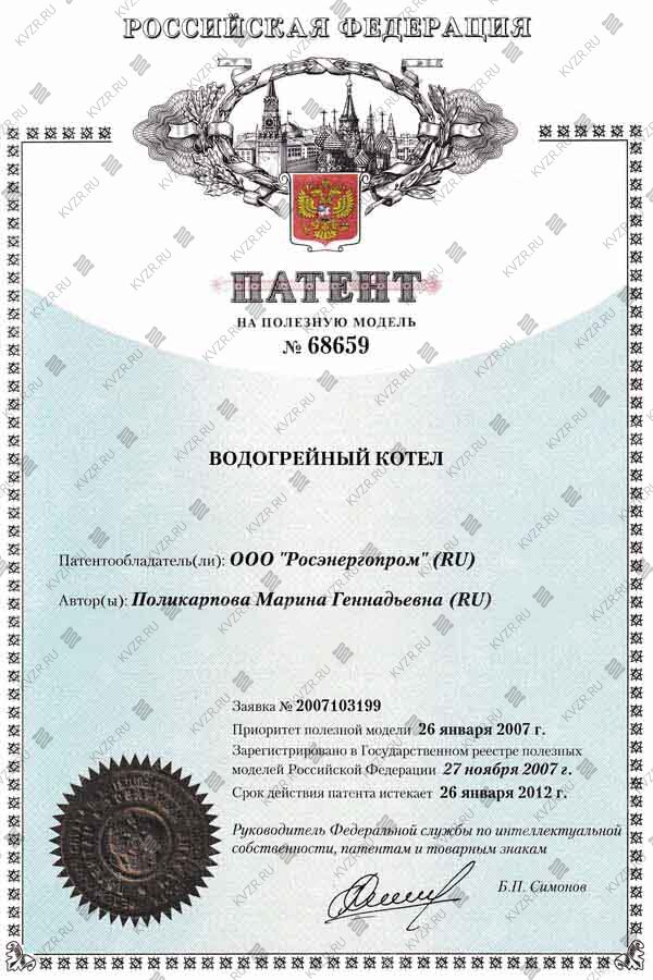 Выдан ПАТЕНТ ООО КЗ «РОСЭНЕРГОПРОМ» на изобретение ВОДОГРЕЙНЫЙ КОТЕЛ