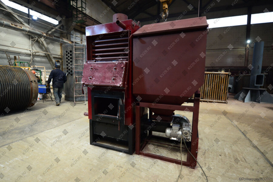 Конструкция водогрейных пеллетных котлов - водотрубная стальная с вихревой топкой или ретортной горелкой, бункером и автоматической шнековой подачей.