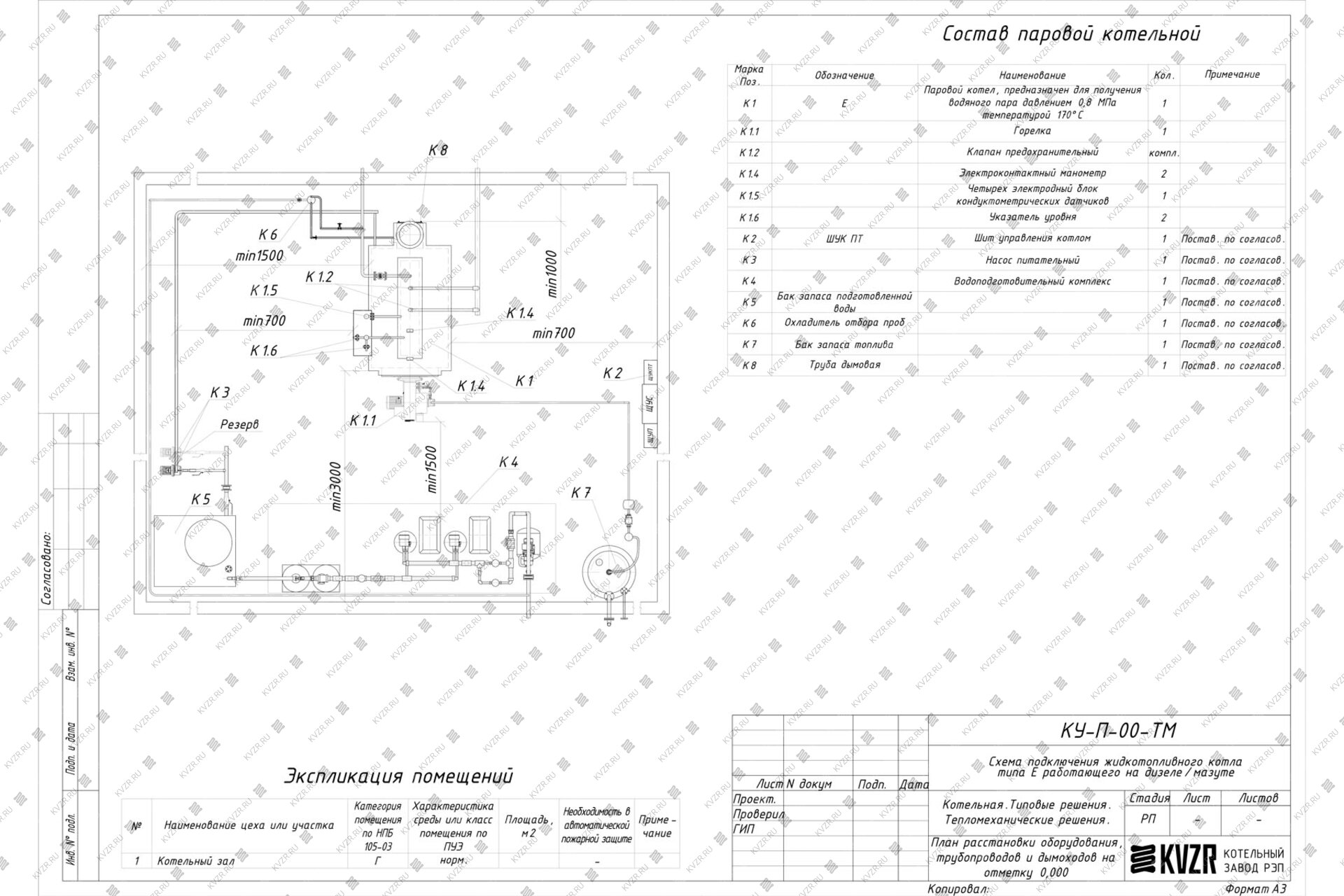 Для правильного подключения парового котла Е-0.3-0.9 М мазутного в котельной необходимо оставить проемы для обслуживания оборудования во время эксплуатации. Эти расстояния рекомендованы СНИП II-35-76. На данной схеме представлены их размеры. Кроме того мы составили примерный план, как можно произвести расположение подключение оборудования, а также указали перечень минимально необходимого вспомогательного оборудования для работы котла.
