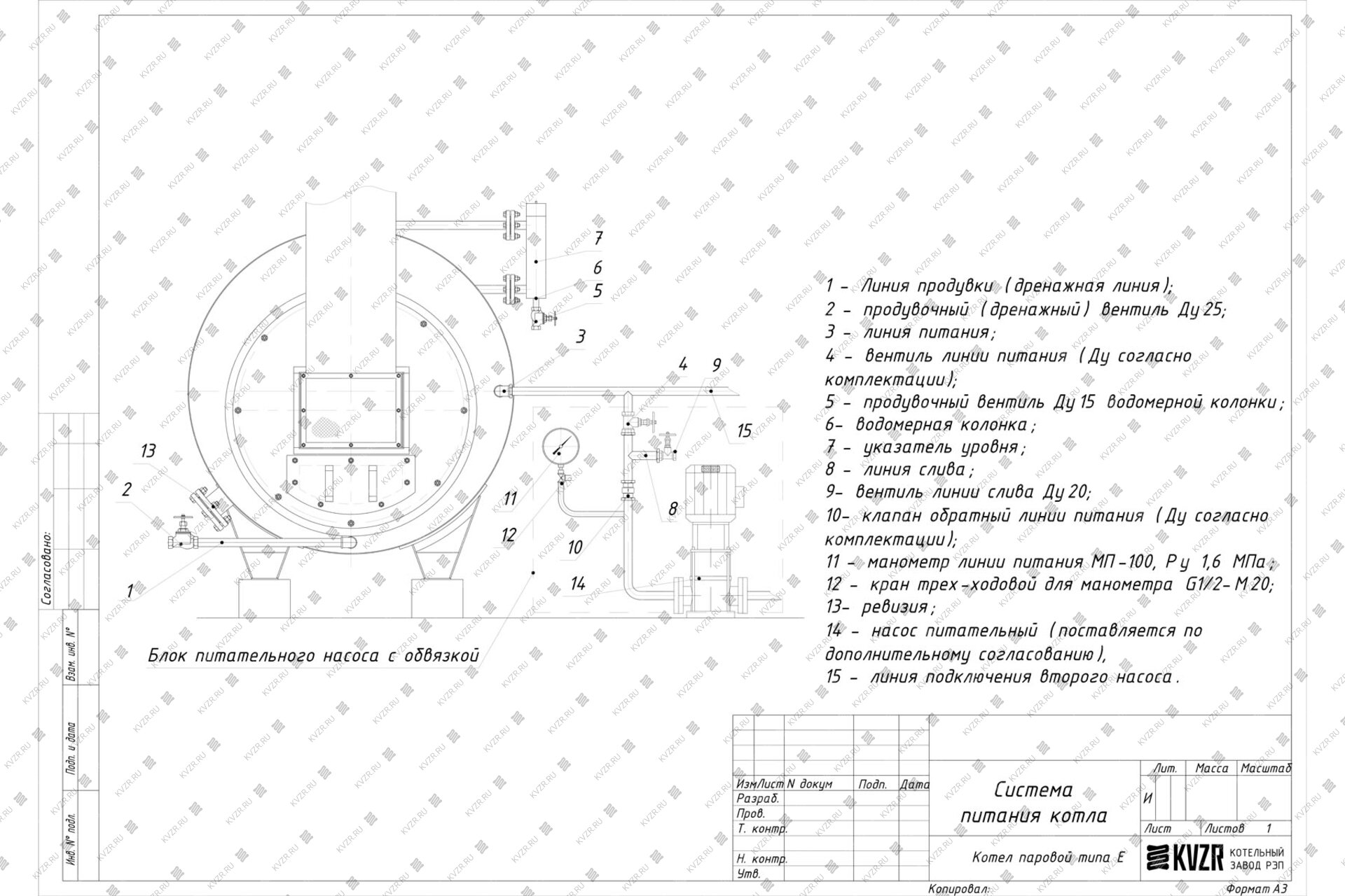 Подпитка котла ведется из питательного бака через насос, соединительную арматуру. На трубопроводе подпитки котла водой должно быть установлено запорное устройство и обратный клапан. Запорное устройство должно располагаться между котлом и обратным клапаном.
