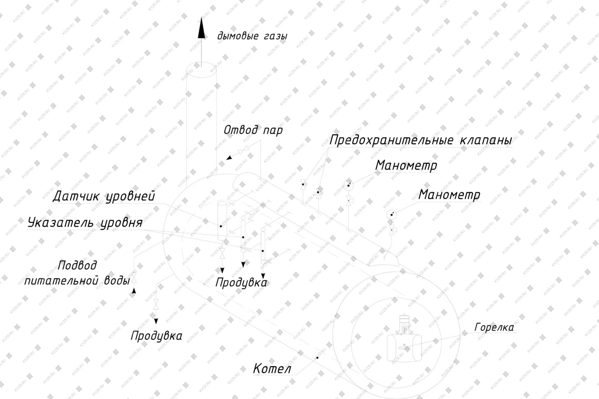 На боковой части корпуса устанавливается датчик уровней воды, связанный с паровым и водным пространством котла соединительными трубками не менее Ду25.