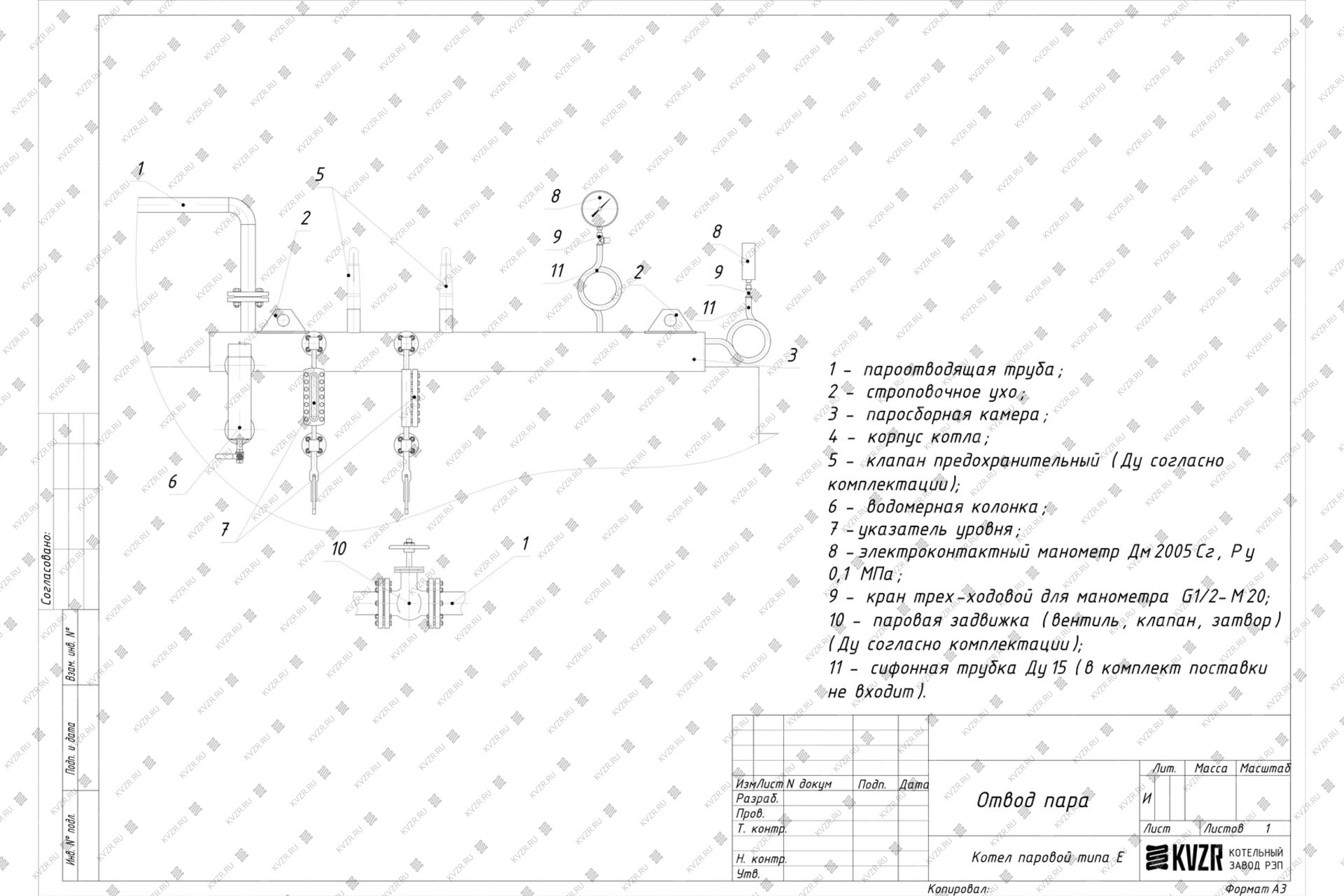 При работе котла питание водой парового котла Е-0.3-0.9 М мазутного производится через штуцер.