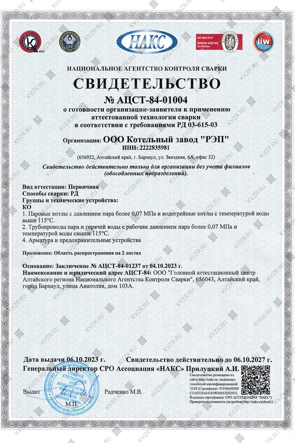 Получено свидетельство об аттестации технологии сварки на следующие виды оборудования:
